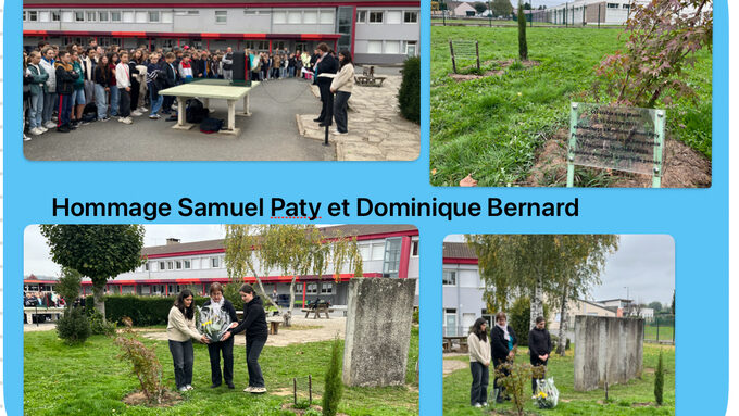 Une lecture et une minute de silence en hommage à Samuel Paty et Dominique Bernard. Tous les élèves avec les professeurs ont participé à ce moment de mémoire.